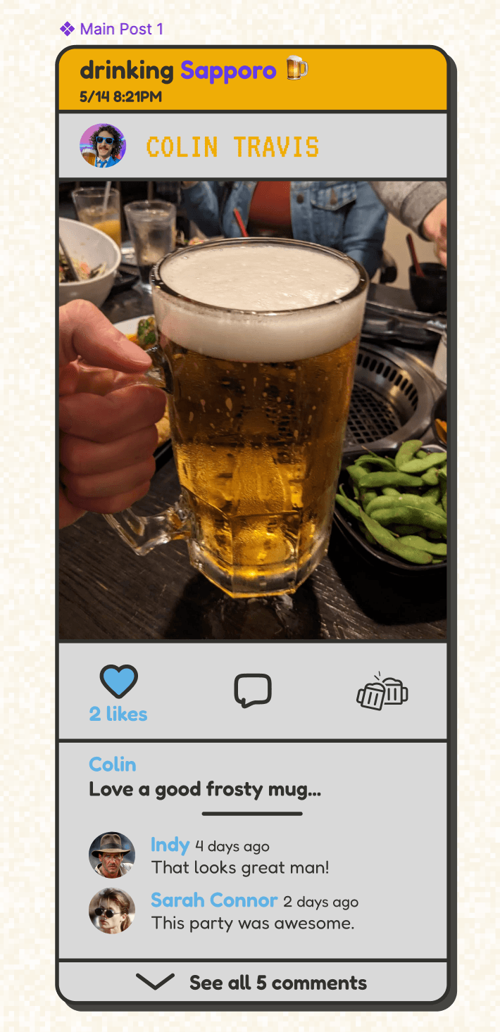 Future features include a cheers feature: being able to react to posts with an image, as well as updates to the profile page allowing a user to see their stats, which drinks they've shared, as well as follow specific people.