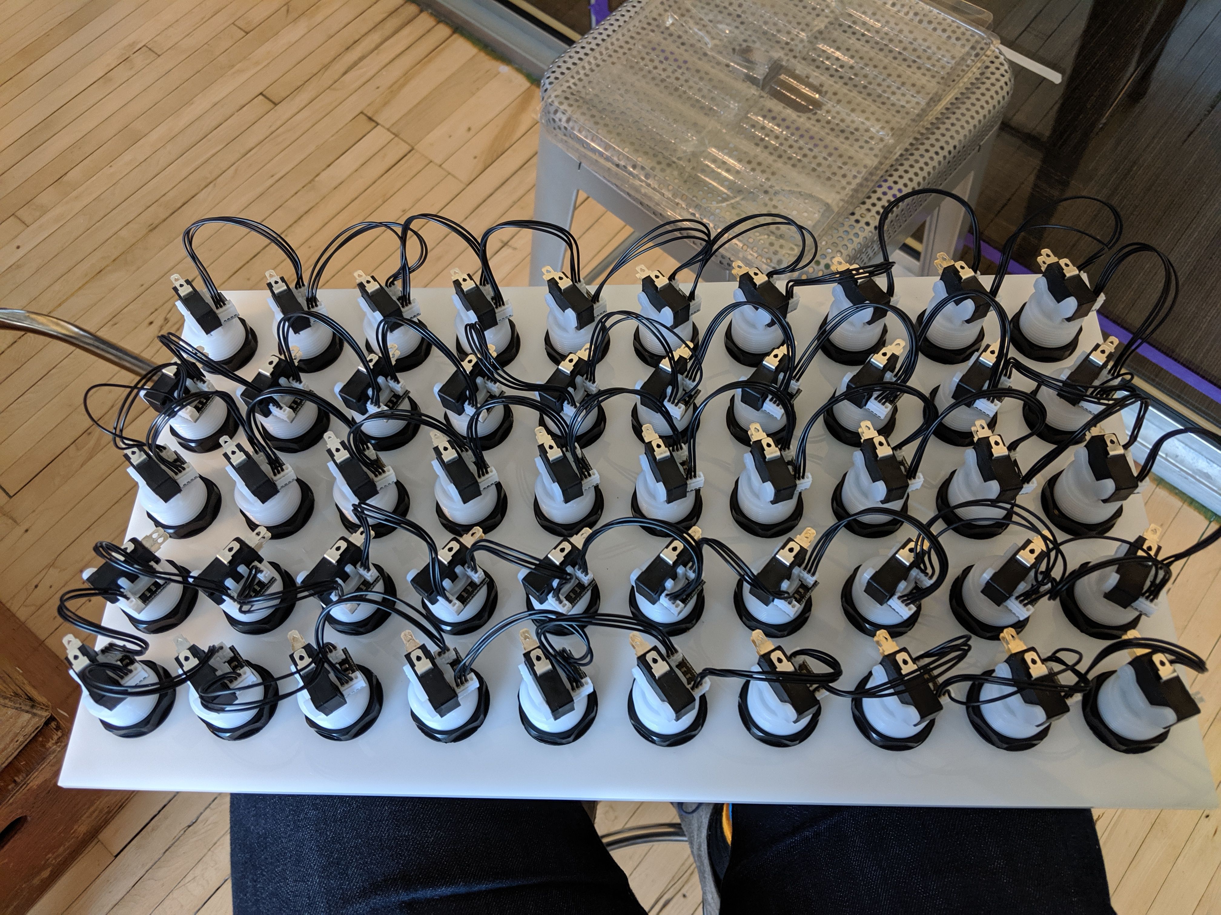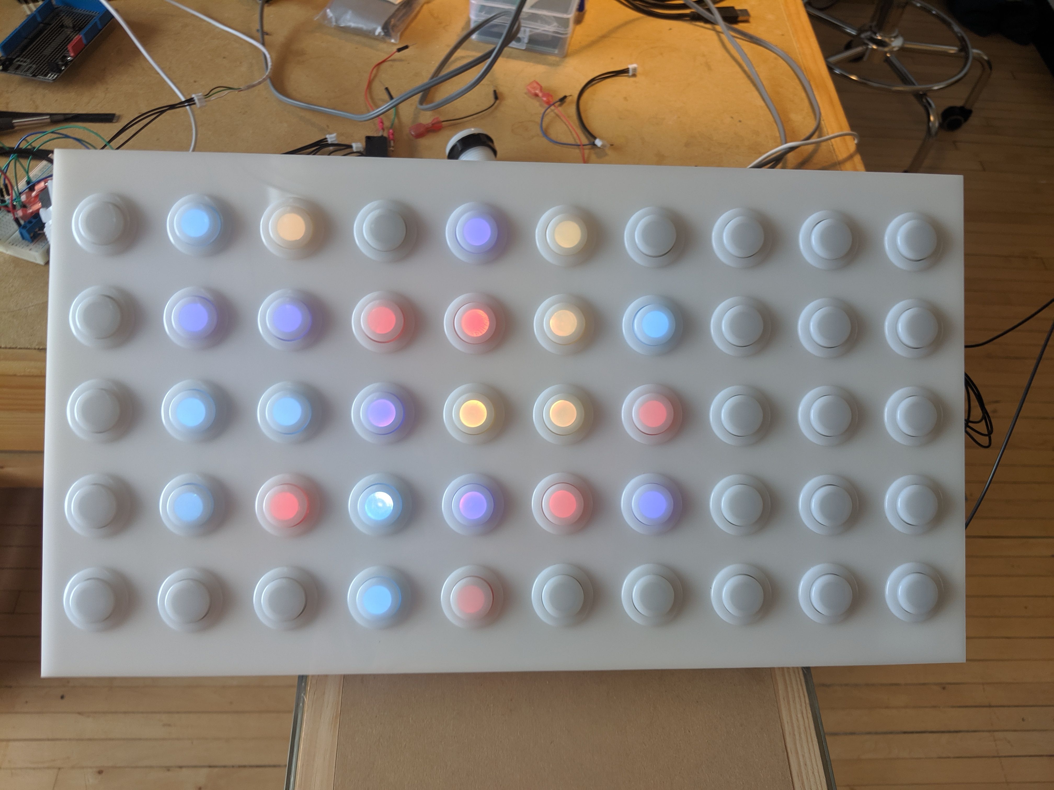An array of 12 panels composed of 50 buttons was fabricated using a local MN arcade shop's custom lighting boards and arcade buttons. Each panel daisy-chained the buttons into a matrix that was controlled by a single Arduino Mega. Power was then distributed and injected across the boards.